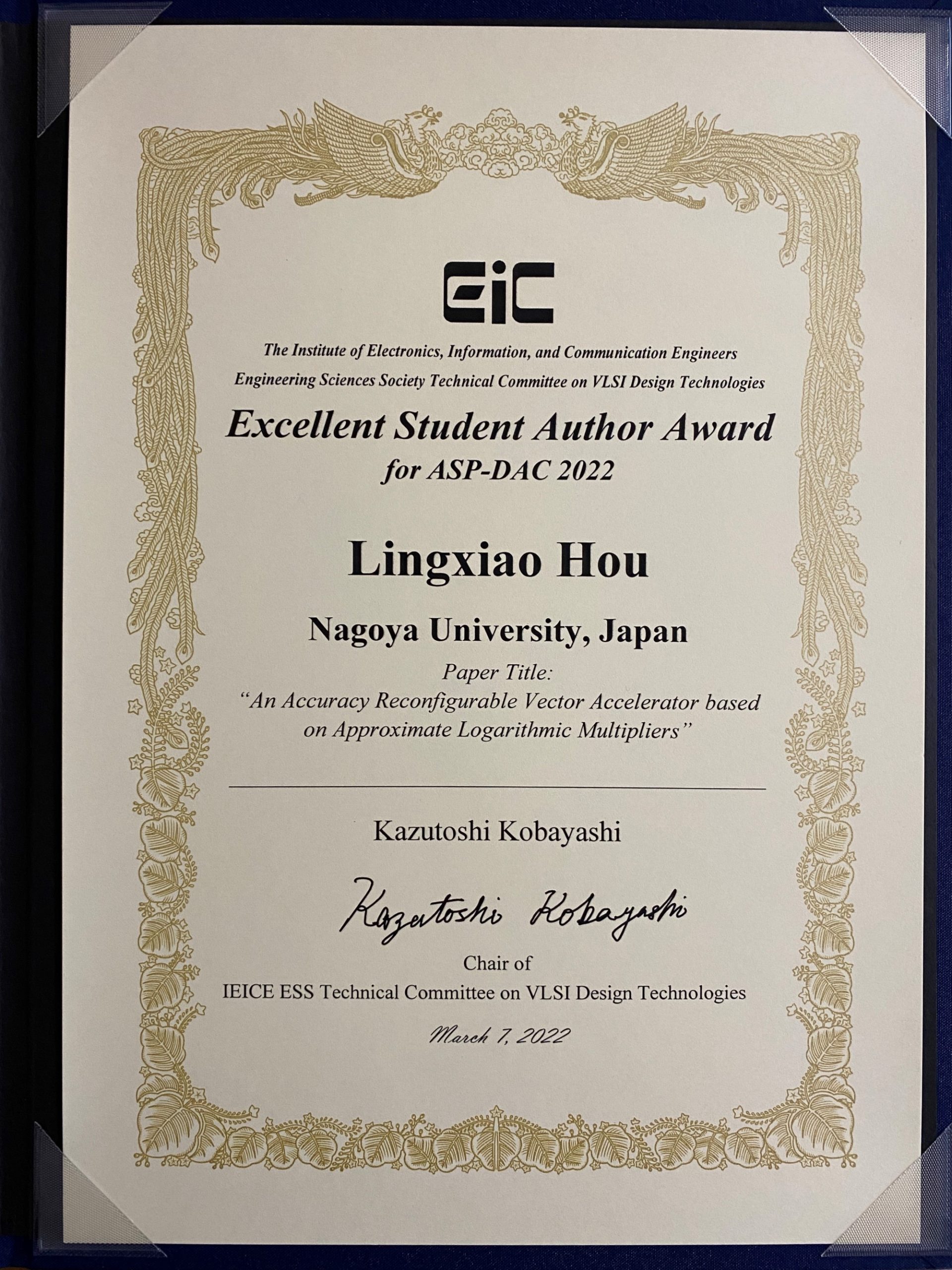 2022年3月7日から8日にかけてオンライン開催された、電子情報通信学会 VLSI設計技術研究会において、M2 の候くんが IEICE VLD Excellent Student Author Award for ASP-DAC2022 を受賞し、記念講演を行いました。おめでとうございます。