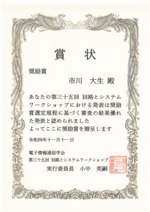 M2 の市川くんが「第35回 回路とシステムワークショップ 奨励賞」を受賞しました。おめでとうございます!下記の発表に対する受賞です。