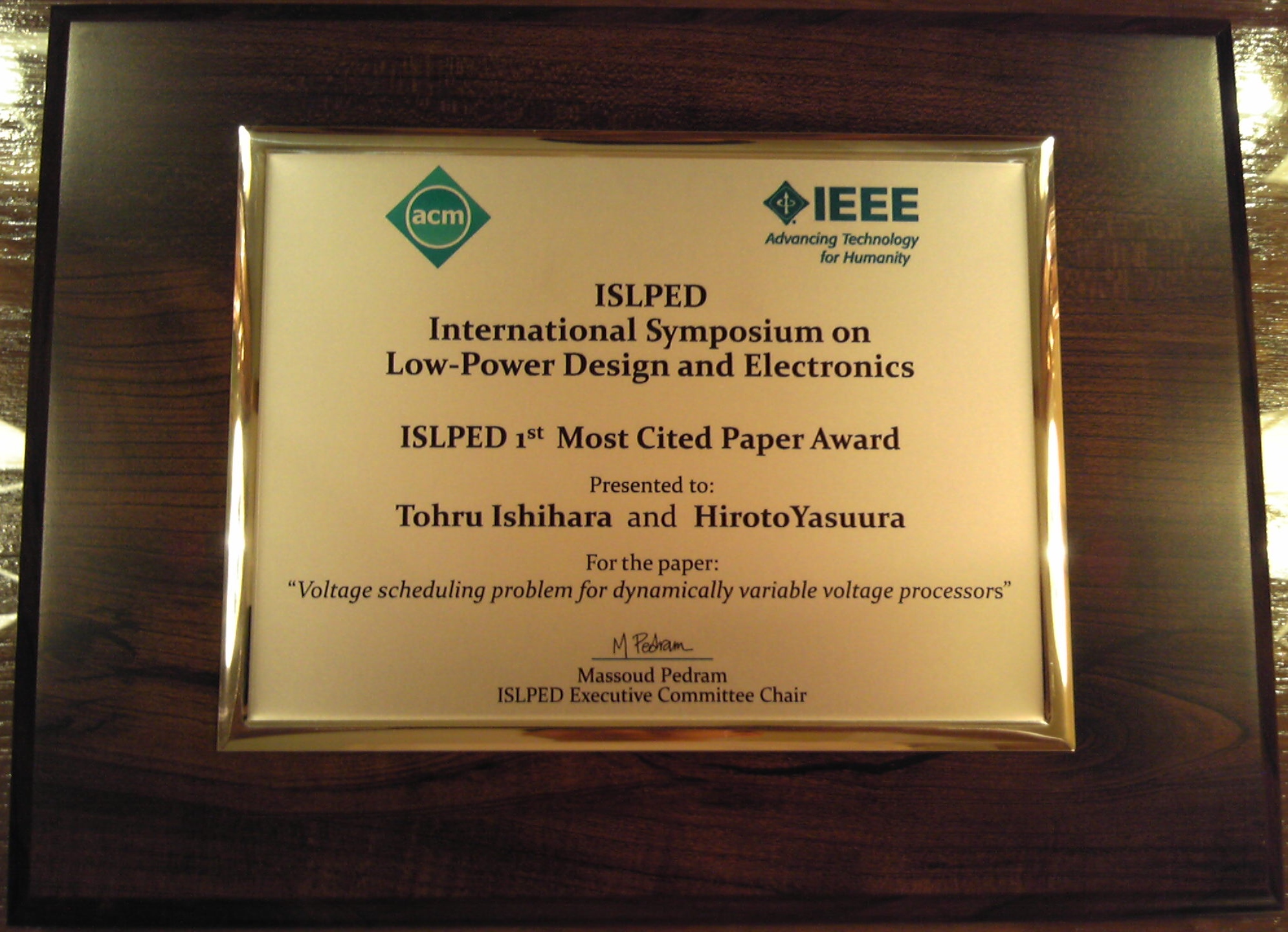 Prof. Tohru Ishihara has been awarded as an author of the 1st most cited paper in 20 Years of International Sympoium on Low-Power Electronics and Design (ISLPED)! The ceremony was held in Rome, Italy on July 22-24, 2015. Authors: Tohru Ishihara, Hiroto Yasuura Paper Title: Voltage Scheduling Problem for Dynamically Variable Voltage Processors The number of citations is more than 800 in Google Scholar, and is 499 in Microsoft Academic Search (as of August 1st, 2015). ![]() ![]() |